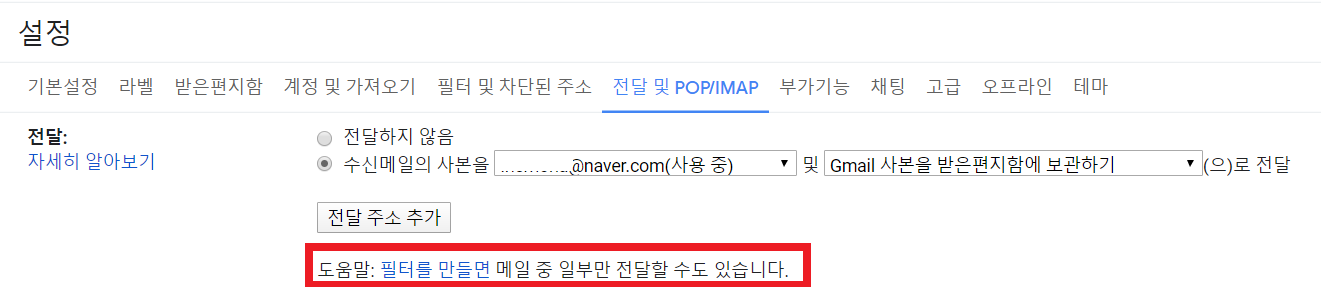 사실 외부메일을 전체 다 가져오는 설정은 네이버에서도 할 수가 있습니다. 하지만 저는 구글 트랜드에서 오는 이메일만 네이버 메일로 가져오고 싶기 때문에 모든 메일이 필요하지 않습니다. 그럴 때는 지메일 설정에서 필터를 추가 해주면 됩니다.