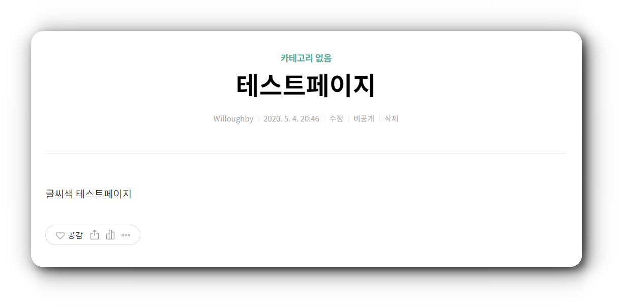 🔻 먼저 티스토리에서 바로 이용가능한 무료 반응형 스킨인 #1에서 기본 글씨체 변경방법을 알아보겠습니다. 일단 테스트 블로그에서 테스트 페이지를 만들어 비공개로 발행했습니다. 아무것도 손대지 않고 제목과 글씨만 써서 글을 발행 했습니다. 아래처럼 기본 회색의 글씨가 출력이 됩니다.