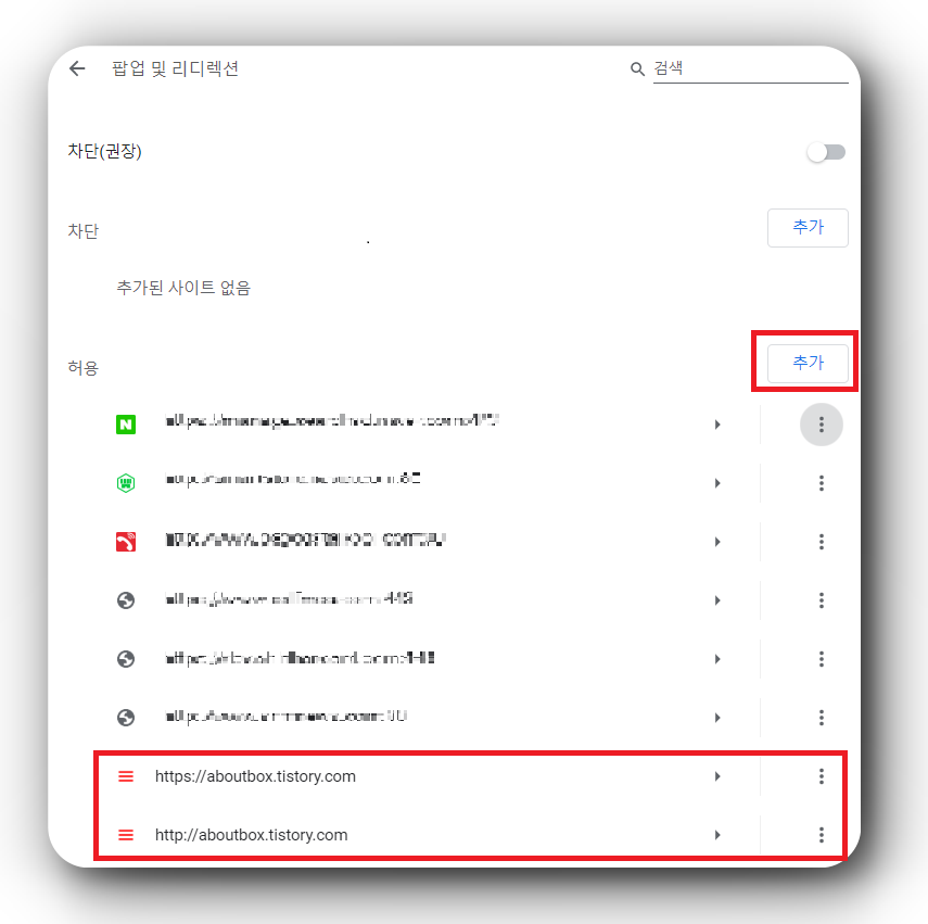 🥖 팝업 및 리디렉션에서 허용 옵션 오른쪽 위의 추가를 선택해서 본인의 티스토리 블로그 URL을 입력해 줍니다. 이제 크롬 완전히 종료한 후, 다시 Daum 포토 업로더를 실행하면 플래시 차단이 풀려있게 됩니다.