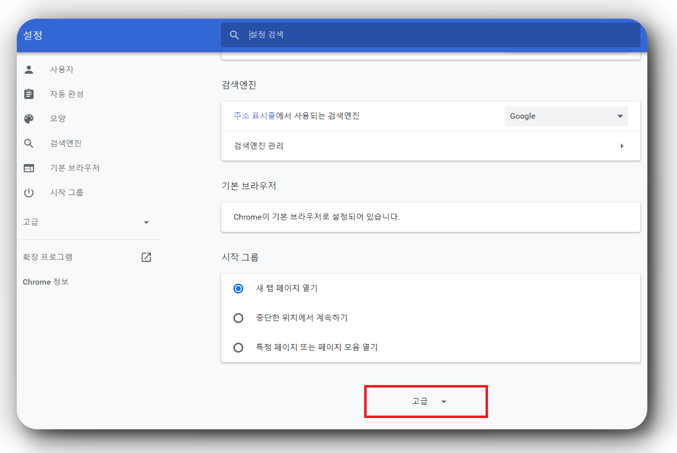 🥖설정으로 진입하였다면 아래 '고급' 을 눌러서 설정창을 확장합니다.