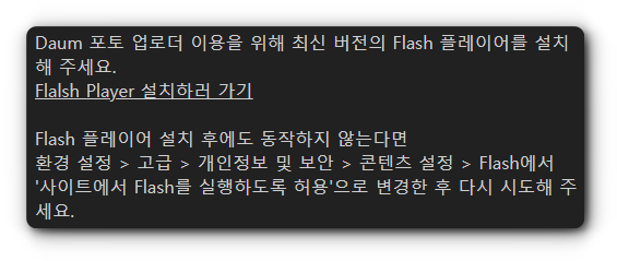 🥖티스토리 글쓰기에서 사진을 넣기 위해 Daum 포토 업로더를 누르면 아래와 같이 Flash Player를 설치하라고 나온다.
