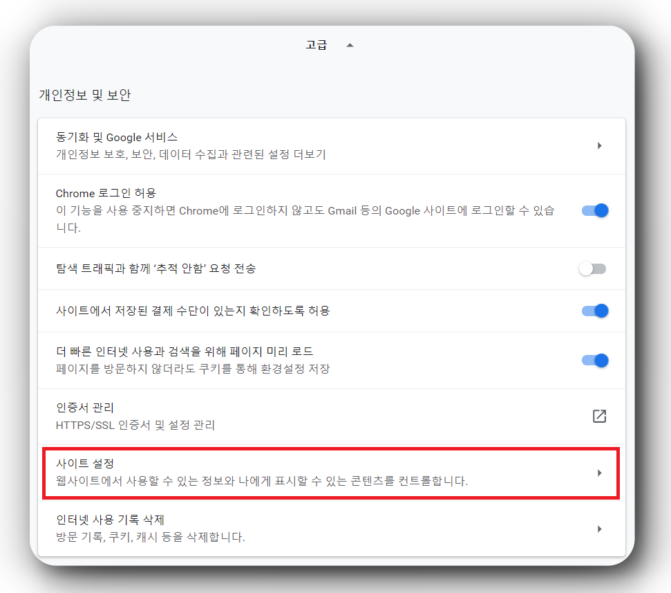 🥖고급을 누르면 아래 더 많은 기능들이 보여지는데, 개인정보 및 보안에서 '사이트 설정'을 찾아서 진입해줍니다.
