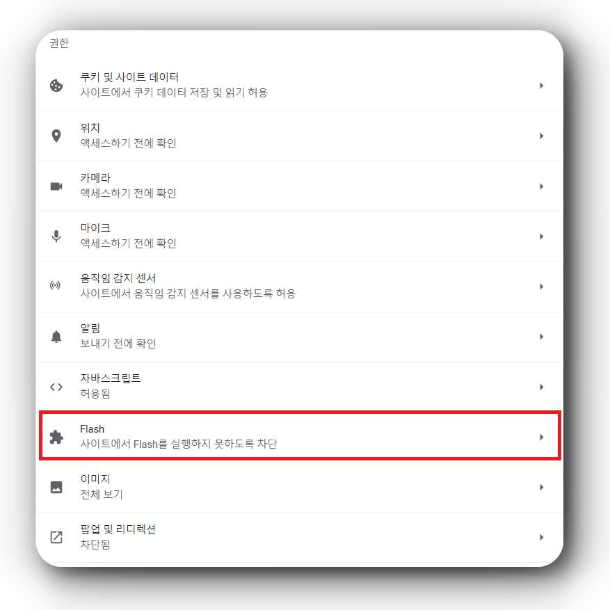 🥖 사이트의 권한을 설정할 수 있는 목록이 뜨는데, 그 중, Flash를 찾아 진입해 줍니다.