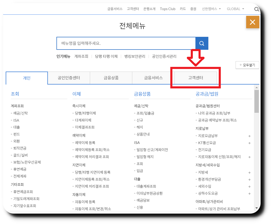 🥖 전체메뉴가 나오면, 고객센터로 진입해 줍니다.
