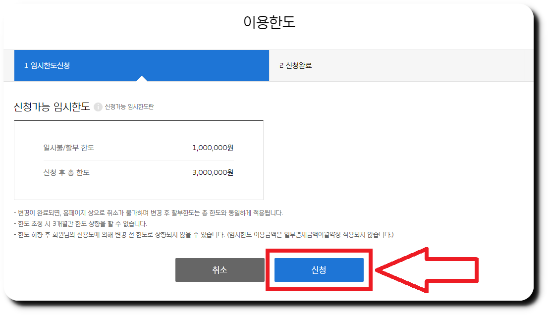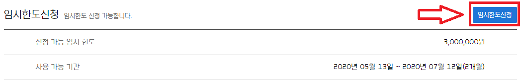 🌈 임시로 한도를 상향할 수 있는 곳으로 진입하셨습니다. 기존 1백만원에서 3백만원으로 총 2백만원의 증액을 요청할 수가 있네요. 개인마다 다를 수 있기에 카드사에서 직접 확인하셔야겠습니다.