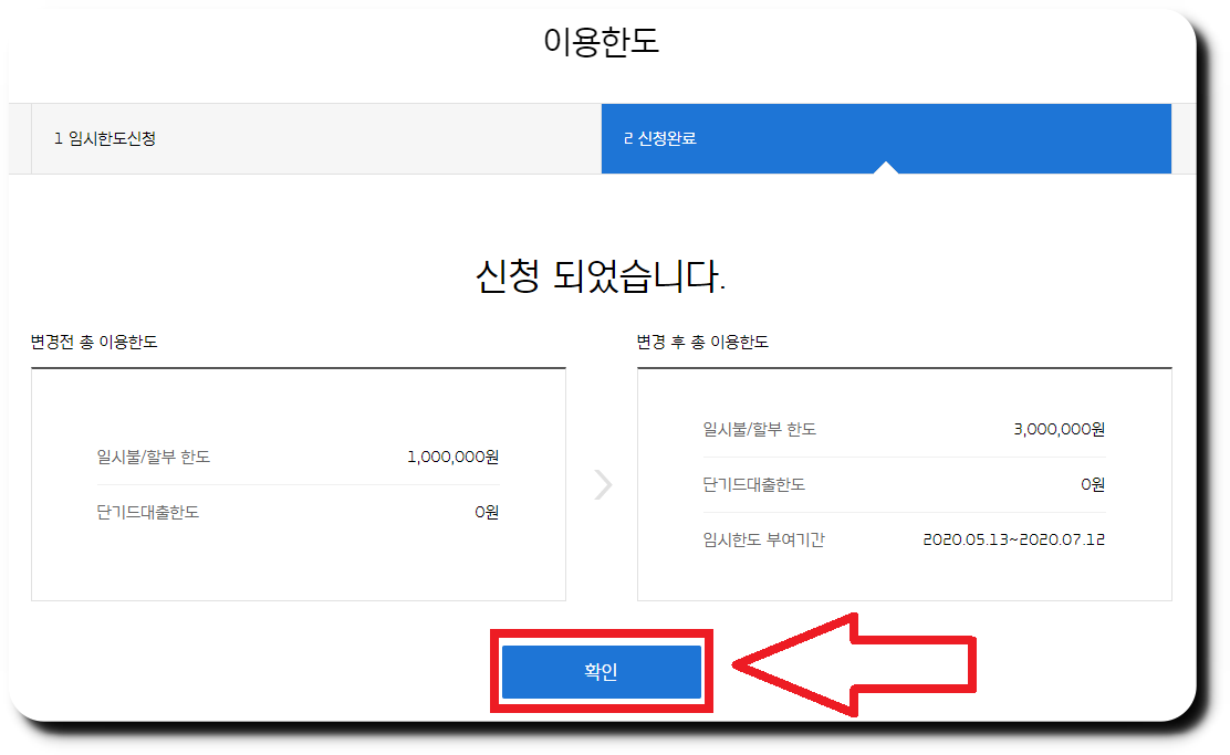 🌈 한도 신청하기를 누르게 되면 바로 신청이 되니 꼭 확인하고 신청해야 하겠습니다. 이렇게 모두 완료가 되었습니다.