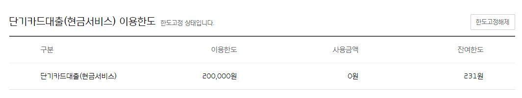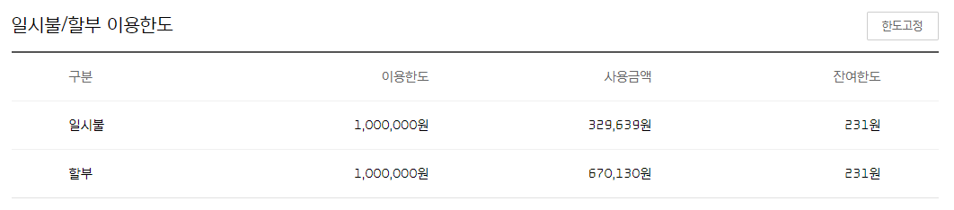이미지처럼 231원만 남았기 때문에 더 이상 사용할 수가 없습니다. 저 금액의 대부분이 할부이기 때문에, 몇개월동안 묶여버렸습니다.