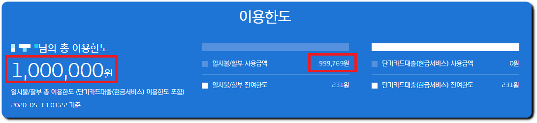 🌈 로그인을 한 뒤 이용한도에 접속하게 되면 본인의 카드 이용한도를 확인할 수가 있습니다. 저는 999,769원을 사용하여 잔여한도가 231원이 남았습니다. 애초에 한도를 크게할 걸 실수했네요.