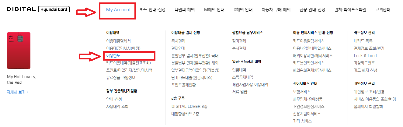 🌈임시한도상향하는 방법입니다. 우선 https://www.hyundaicard.com 현대카드 홈페이지로 접속해서 My account 의 이용한도에 진입해 줍니다.