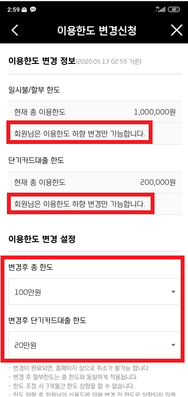 변경이 완료가 된 후에는 홈페이지에서는 취소가 불가하다고 합니다. 또한 한도 조정시 3개월간 한도 상향을 할 수가 없다고 하니 주의해야하겠습니다.⭐⭐⭐⭐⭐
