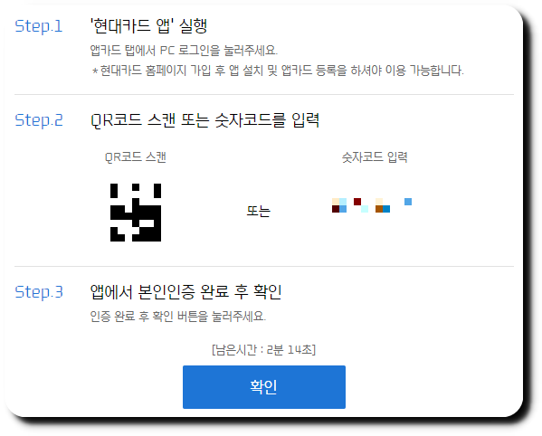 🌈 로그인을 해줍니다. 현대카드 앱이 있으신 분들은 앱을 실행해서 pc 로그인을 이용하여 QR코드를 스캔하여 주시면 됩니다.