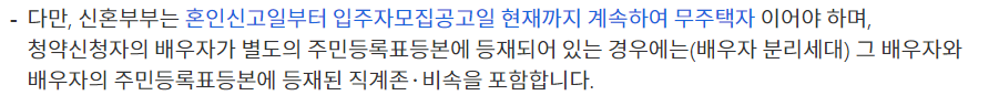 - 무주택자만 신청할 수 있습니다, 다만 혼인신고를 할 때부터 입주자 모집 공고일까지 계속 집이 없어야합니다.