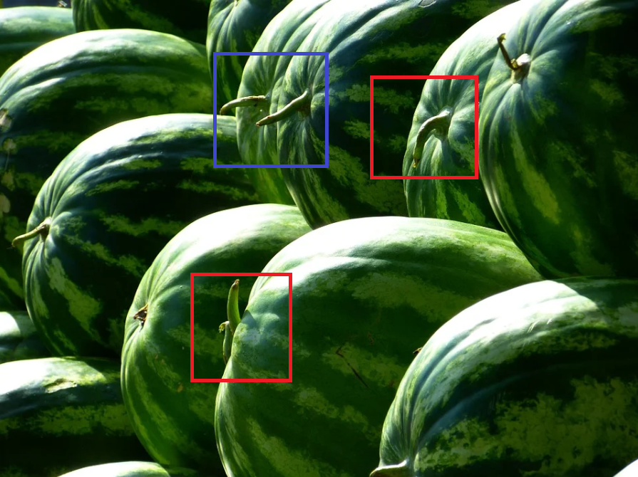 아래 사진에서 보면 파란색 네모칸의 수박은 꼭지가 서있고 빨간색 표시를 해 놓은 수박들은 꼭지가 누워있습니다. 누워있다면 당도가 높을 확률이 더 높습니다.