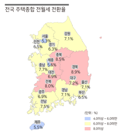 🌈 이렇게 계산된 전월세 전환율이 적당한가의 판단은 복합적이여야합니다. 그 의미는 부동산중개소에서 해주는 말을 참고해서 판단하여야합니다. 본인의 전세집의 동네를 살펴보세요. 그 이유는 한국감정원에서 내놓는 보도 자료중 '지역별 전월세 전환율'이 있습니다. 내가 내는 전환율이 적정한가를 판단할 수가 있습니다.