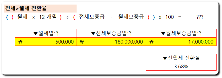 🌈 계산기를 귀찮게 꺼내지 않으시도록 전월세 전환율 계산을 엑셀로 만들어 보았습니다. 노란색으로 입력할 수 있는 곳에 간단하게 입력을 해주면 전월세 전환율이 자동으로 나오게 됩니다.