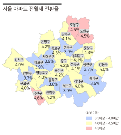 🌈 전월세 전환율이 무엇일까요? 쉽게 풀어서 써보면, 전세에서 월세로 전환을 할 때 얼마나 높은 비율로 전환이 되는지를 나타내는 것입니다. 그래서 '전월세 전환율'이라는 비율이 높으면 높을수록 전세보증금의 금액 대비 월세로 부담을 해야하는 금액이 많아지는 것이고, '전월세 전환율' 비율이 낮다면 '월세'의 부담은 적어지게 되는 것입니다.