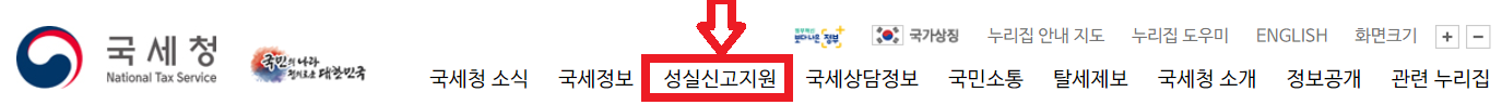 🌈홈페이지에 접속을 하게 되면 아래와 같이 홈페이지 메인화면이 뜨게 되겠죠. 위의 메뉴 중 '성실신고지원'을 눌러봅니다.