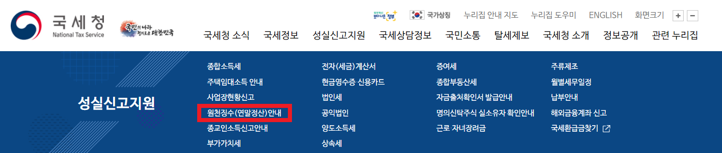 🌈 눌러주셨으면 하위 메뉴 중 제일 왼쪽에서 위에서 네번 째에 '원천징수(연말정산) 안내' 라는 메뉴를 눌러서 진입을 해줍니다.