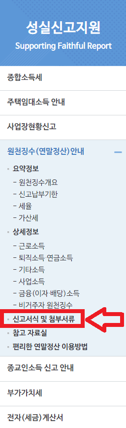 🌈 성실신고 지원 메뉴에서 원천징수 연말정산 안내로 진입하였다면, 왼쪽의 메뉴바에서 '신고서식 및 첨부자료'를 눌러줍니다.