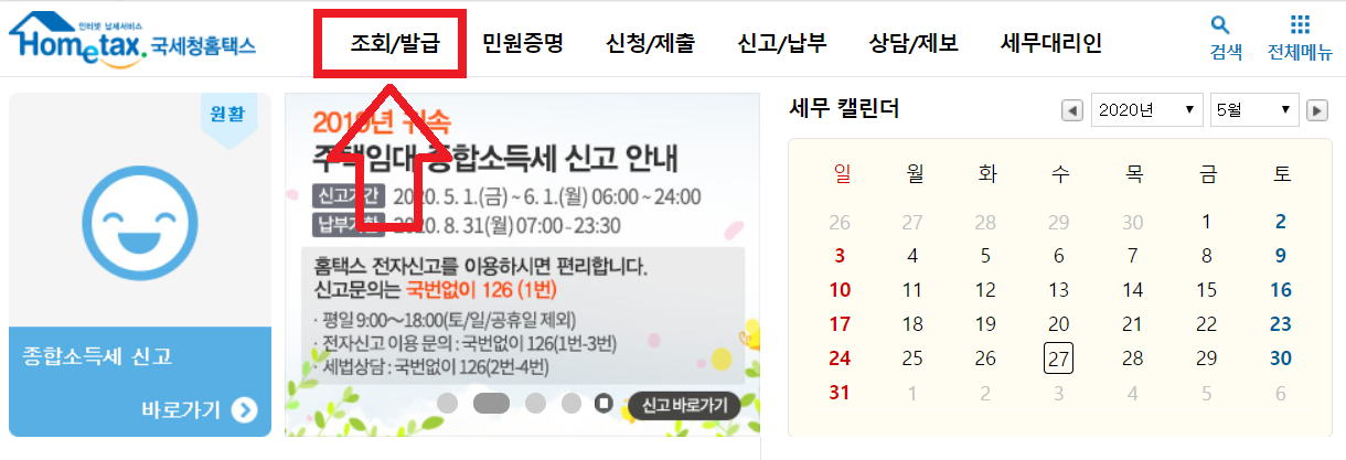 🌈 아래 이미지처럼 홈택스에 접속하셨다면, 상단의 메뉴 중 가장 첫 번째에 있는 조회/발급을 눌러 줍니다.