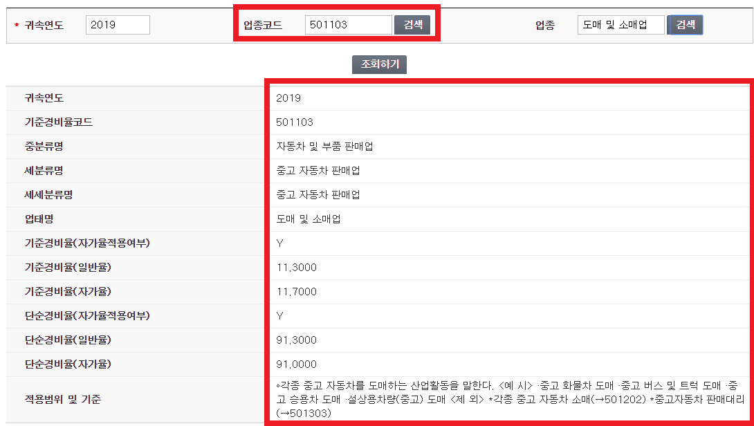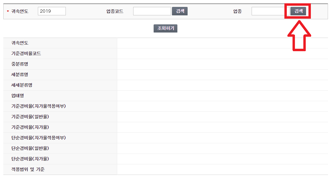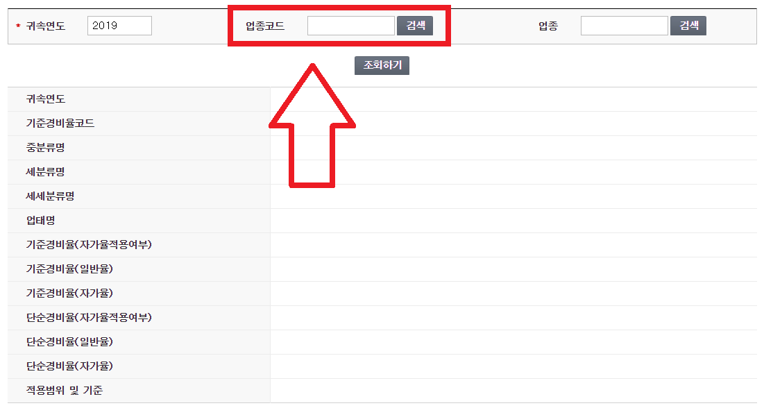 🌈이제, 기준 (단순) 경비율 관리 탭으로 진입이 되었습니다. 이제 여기에서 조회를 할 수가 있게 되는데요. 업종코드를 알고 계시면 업종코드를 조회하며 아래에 귀속연도, 기준경비율코드, 그리고 기타 분류 명등의 내용들이 뜨게 됩니다.