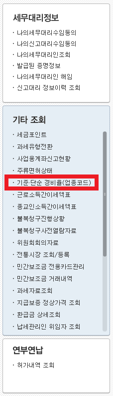 🌈 조회/발급으로 들어오셨다면 거의다 오셨습니다. 인내를 가지고 따라와 주시면 됩니다. 메뉴가 엄청나게 많은데, 오른쪽 메뉴 중 '기타조회'에서 다섯 번 째 줄에 있는 '기준*단순 경비율(업종코드)'를 눌러주세요.