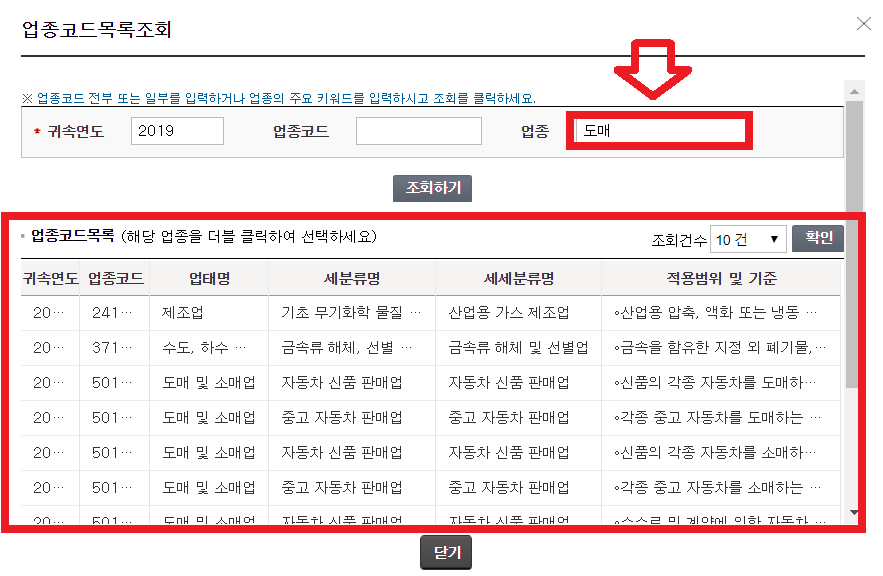 🌈 그러면 창이 하나 뜨게 되는데 업종에, 원하는 업종을 검색해 봅니다. 저는 '도매'가 바로 생각나서 도매를 입력해 보았습니다. 이제 아래에 '도매'에 관련된 업종코드 목록이 뜨게 됩니다.