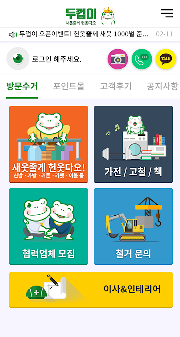 🌈마지막으로 소개 해드릴 어플은 두껍이 수거 입니다. 마찬가지로 헌옷 (신발,가방,커튼, 카펫,이불)등의 헌옷을 수거해주고 있습니다. 제공하는 서비스는 크게 아래와 같이 다섯가지로 나뉩니다.