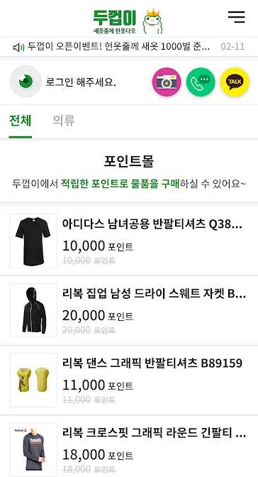 두껍이 어플의 가장 특이한 점은 포인트를 지급해주고, 지급받은 포인트로 포인트몰에서 의류 몇가지를 구매할 수 있다는 것입니다. 회원가입시 2000P지급, 10kg 마다 100P 지급 그리고 소개 하거나 리뷰를 작성해주면 1000P씩을 주는 등의 포인트제도를 운영하고 있어서 어플의 고객유입 활성화에 도움이 되는 것으로 보입니다.