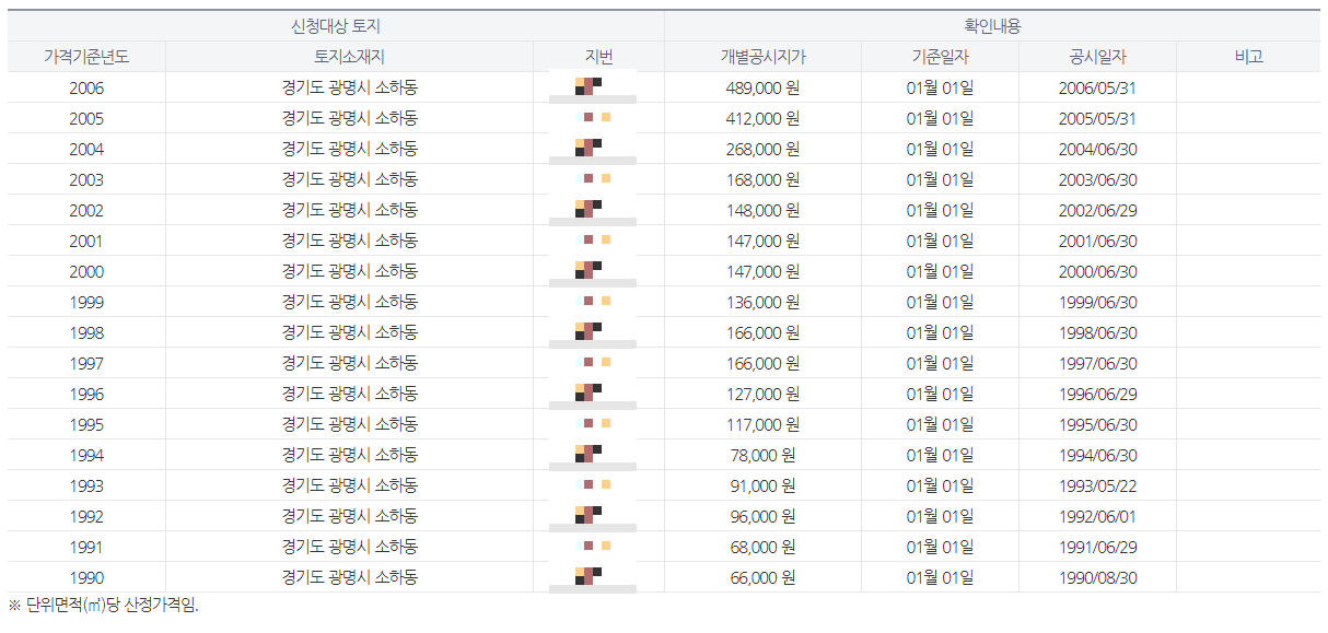 🌈제가 과거에 살았던 경기도 광명시 소하동의 지번을 검색하면 아래와 같이 개별공시지가가 나오게 됩니다.