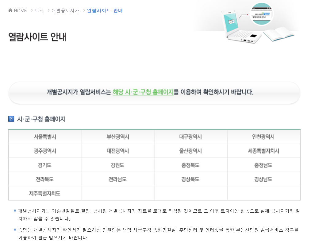 🌈 토지 메뉴▶개별공시지가▶열람사이트 안내로 접속하셨습니다. 이제 원하는 지역을 선택해야하는데, 선택을 하면 해당하는 시/군/구청의 웹사이트로이동이 됩니다. 자료는 각 지자체에서 열람을 할 수가 있기 때문입니다. 저는 제가 살고 있는 경기도로 들어가 보겠습니다.