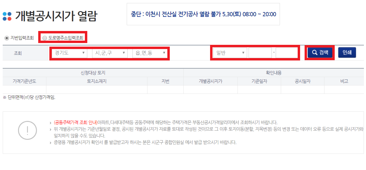 🌈경기도 지역의 개별공시지가 열람을 할 수 있는 조회안내서비스 웹사이트로 이동이 됩니다. 다른 지역의 조회를 검색을 원하신다면 앞 전 페이지로 돌아가서 다시 선택을 하셔야하니 주의하시길 바랍니다. 현재페이지에서는 경기도 갭려공시지가만 열람이 가능하도록 되어있습니다.