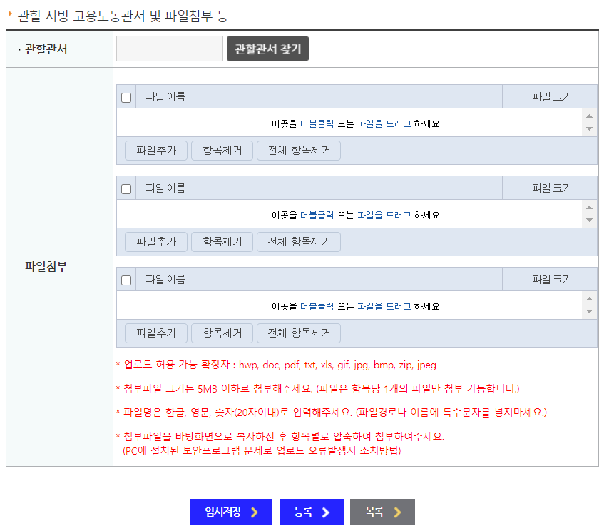 🌈 아래 관할 관서는 회사를 입력을 하면 자동으로 관활하는 지방고용노동관서로 입력이 되게 되어있습니다. 그리고 아래 첨부파일에는 증명할 서류들을 올려주시면 됩니다. 위에서 말씀드렸다시피 근로계약서 등 진정서 등을 올리면 됩니다. 모두 입력을 하셨다면 등록을 눌러서 신청해줍니다.
