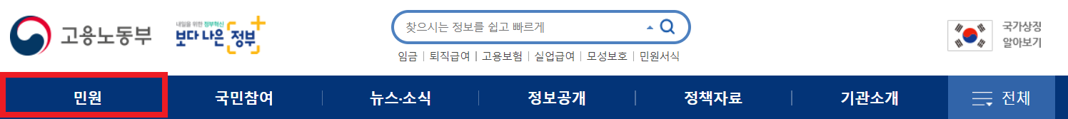 🌈고용노동부 민원마당으로 접속합니다. 메뉴 중 민원을 고른 후, 하위 메뉴에서 온라인 서식 민원신청을 눌러 진입해 줍니다.