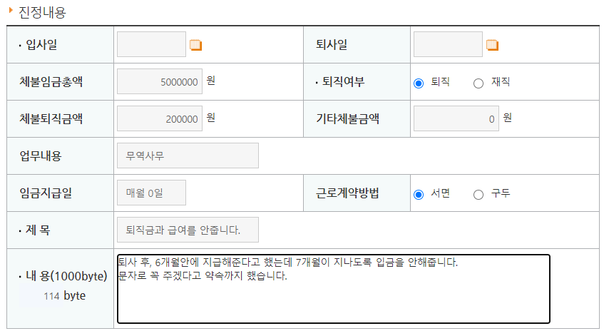 🌈 진정내용에는 아래와 같이 입사일, 퇴사일 , 퇴직여부, 체불금액, 업무내용, 임급지급일, 근로계약방법, 제목과 내용에 대해 기재를 해줍니다. 아래이미지는 제가 예시로 적은 것입니다.