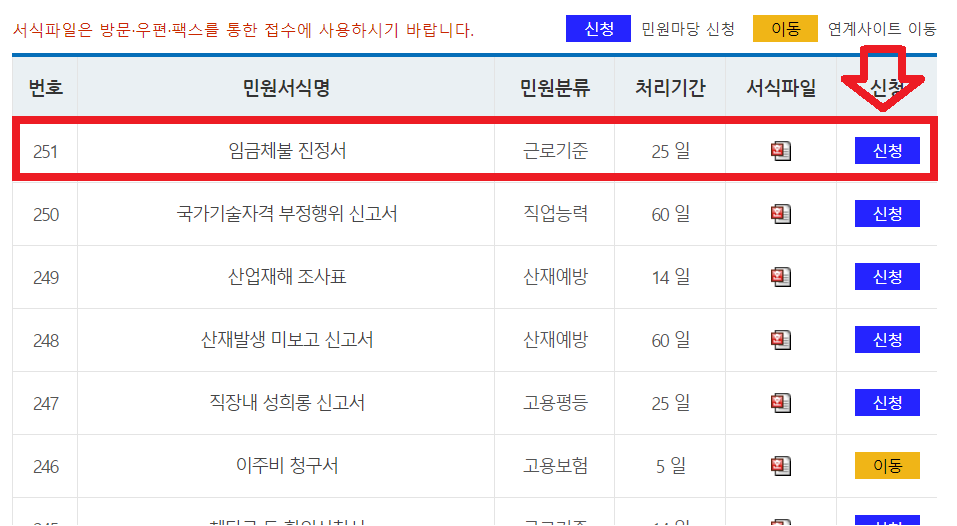 🌈민원 분류 중 원하는 민원을 선택해 주면 됩니다. 임금체불 진정서를 신청해 봅시다.