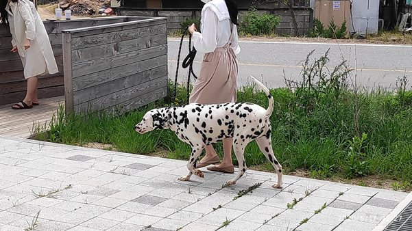 주문을 마치고 야외에서 시원한 바람을 맞으며 친구들과 얘기하고 있는데, 주인분이 분덕이를 데리고 카페 한바퀴를 돌며 산책을 하는 것을 봤어요,, 달마시안 강아지는 활발하고 장난기가 많다고 들었는데, 분덕이는 주인과 천천히 얌전하게 잘 걷네요. 엄청 순한 것 같습니다.