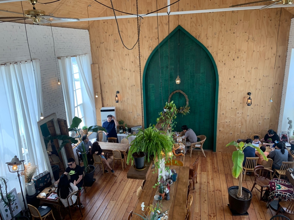 본격적으로 카페 내부를 한번 보여드리겠습니다. 전체적으로 우드와 화이트 컬러가 너무 조화롭게 인테리어 되어있었습니다. 내부에서도 역시 초록문이 딱 포인트로 자리하고 있네요