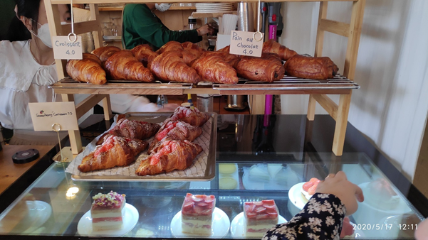 이 중 뭘 먹을지 고민하다가 간단하게 커피 한잔이 생각이 나서 아이스라떼를 주문했습니다. 밀가루 덕후인 전 케익도 그냥 넘어갈수 없어서 딸기타르트와 치즈케익까지 주문을 완료했습니다.