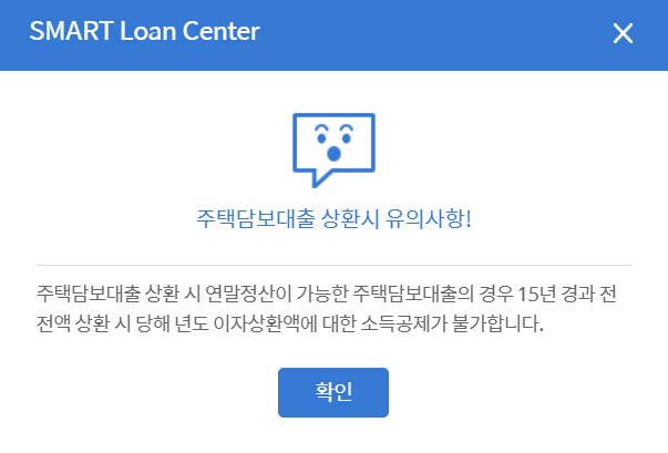 🌈 주택담보관련 상환할 때 연말정산이 가능한 주택담보의 경우 15년이 경과하기 전에 전액을 상환했다면 당해 년도에 이자상환금액에 대해서는 소득공제가 불가하다고 안내창이 뜹니다.