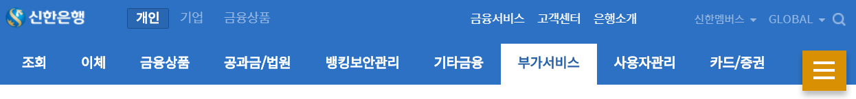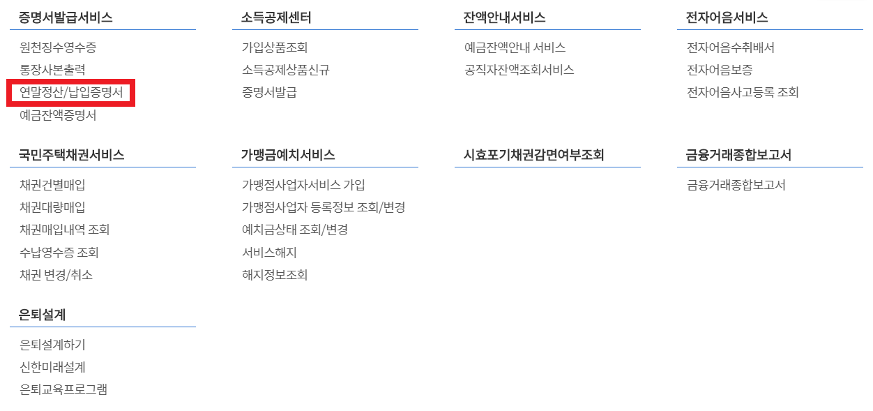 🌈 로그인을 해주셨다면, 신한은행의 메뉴 중, 개인으로 진입해 준 뒤, 메뉴바 중 '부가서비스'의 하위 메뉴에서 연말정산/납입증명서를 찾아 줍니다.
