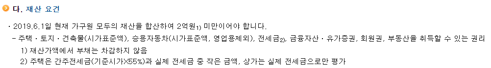 세번 째는 재산 요건에 충족을해야합니다. 재산요건은 2019년 6월 1일 기준으로서 모든 재산이 2억미만 이어야 합니다. 물론 전세금 자동차 땅 등도 포함해야합니다.