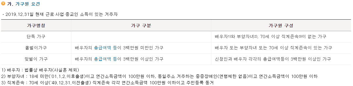 첫 번 째로 가구원 요건에 부합해야합니다. 가구를 구분할 때의 기준은 배우자가 벌고 있는 총급여액이며, 급여가 3,000,000만원 미만인지 등을 파악해야합니다.