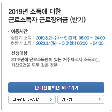 🌈 반기 근로장려금은 상반기 소득은 2019.08.21 ~ 2019.09.10 이였고 하반기는 2020.03.01 ~ 2020.03.31 이였습니다. 근로자만 신청이 가능한 반기이며 아래 소득요건에 충족해야합니다.