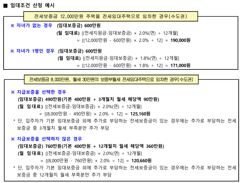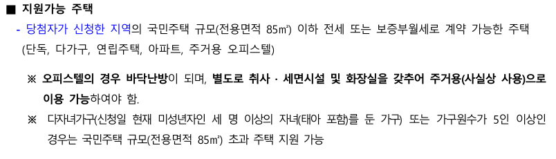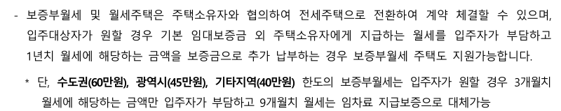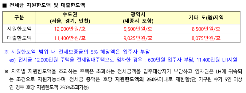 - 임대보증금은 지원한도금액 한도 내에서 전세보증금의 5%를 부담