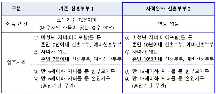 🌈 이번 완화의 골자는 신혼부부를 인정해주는 기간을 7년에서 10년으로 늘린 것과 입주대상자에 해당하는 사람들이 자녀가 있다면 자녀의 나이를 기존 만 6세가 아닌 만 13세 이하로 완화 시켰습니다.
