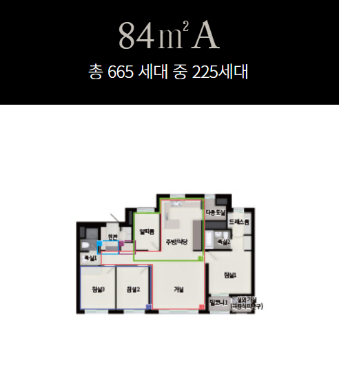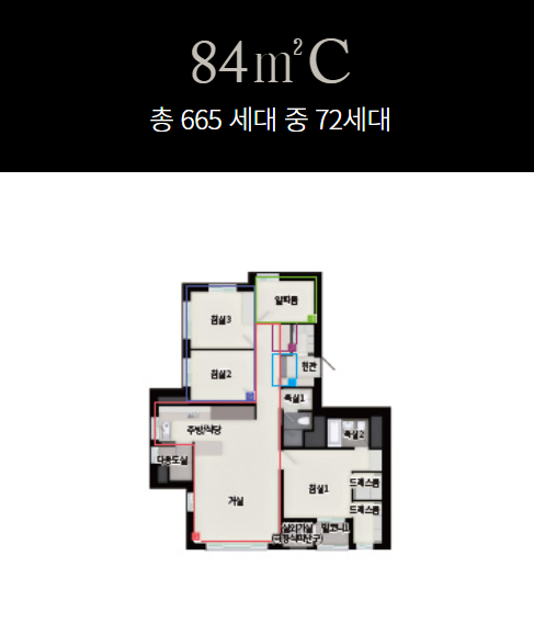 아파트들은 총 665가구로 이루어져있으며 오피스텔은 총 460개로 만들어졌는데 최하 지하3층부터 지상으로는 최대 41층까지 지어지게 되어 상당히 고층에 속하는 주상복합 단지입니다. 오피스텔은 모두 84m2 으로 (전용면적)으로 구성되었고 공간활용도가 높습니다.