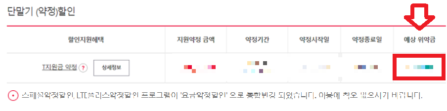 이제 스크롤을 아래로 내려서 할인지원정보로 가게 되면 요금 약정할인 관련 내용이 뜨는 곳에서 예상 위약금을 확인할 수가 있게 됩니다.