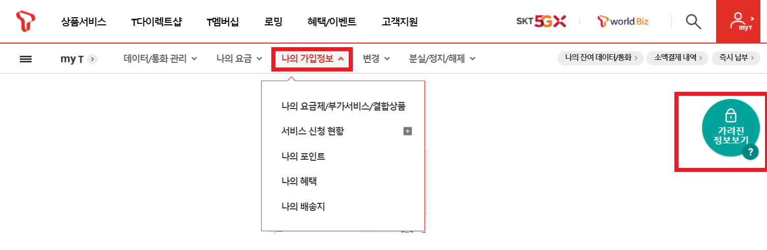 로그인을 해주 셨다면 MYT 메뉴에서 나의 가입정보를 눌러 줍니다. 나의 가입정보로 진입을 해주시게 되면 오른쪽 상단위에 가려진 정보보기를 눌러주셔야합니다. 안누르면.... 안보입니다.