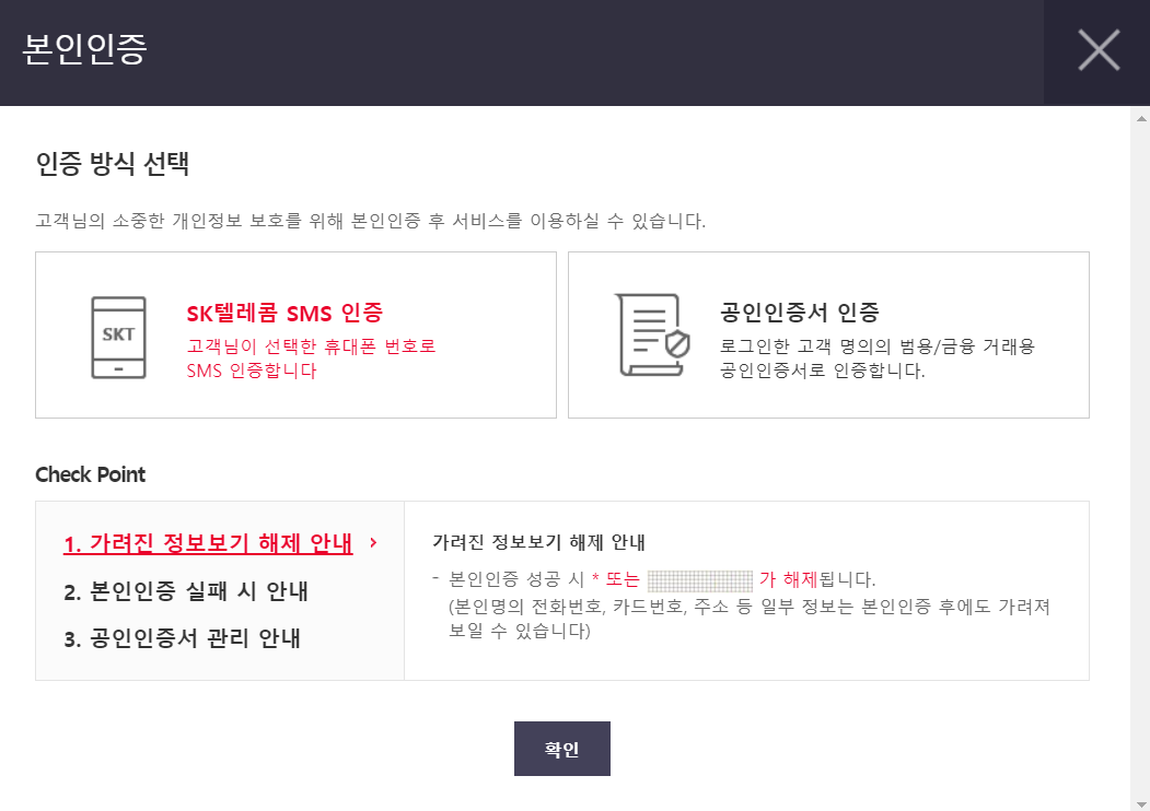누르게 되면 본인인증창이 뜨게 되는데 SMS나 공인인증서로 본인인증을 진행해 줍니다.